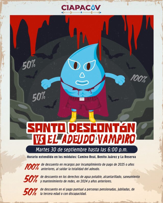 A través de un comunicado de prensa, el Director General de CIAPACOV, Vladimir Parra Barragán, invita a todas y todos los usuarios a aprovechar de un “Santo Descontón vs el adeudo vampiro”, este martes 30 de septiembre habrá importantes descuentos para ponerse al corriente en el pago del servicio de agua, además de horario extendido, de 8:00 a.m. a 6:00 p.m., en las sucursales de Camino Real (Colima), Benito Juárez y La Reserva (Villa de Álvarez)