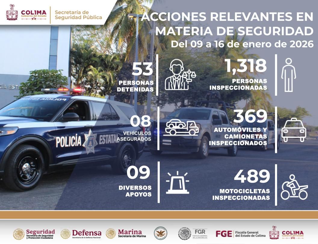 A través de un comunicado de prensa, la Secretaría de Seguridad Pública (SSP) del Gobierno del Estado de Colima, informa que, durante la presente semana, la Policía Estatal Preventiva (PEP) detuvo a 53 personas infractoras de la ley, como resultado de la estrategia permanente ‘Operación Coliman’, que tiene como objetivo reducir la incidencia delictiva la entidad.