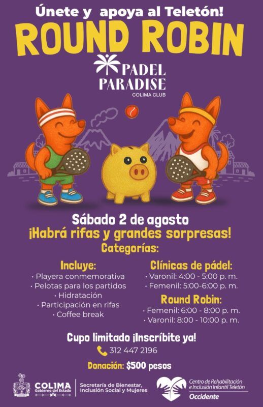 A través de un comunicado de prensa, La titular de la Secretaría de Bienestar, Inclusión Social y Mujeres (Sebiinsom) del Gobierno del Estado de Colima, Viridiana Valencia Vargas, acompañada de Carlos Villarreal, gerente del Club ‘Padel Paradise’, anunció que se realizará un torneo y clínicas deportivas de pádel, con la finalidad de recaudar recursos para sumarlos al Boteo Teletón 2025 y que se logre la construcción de un CRIT en esta entidad.