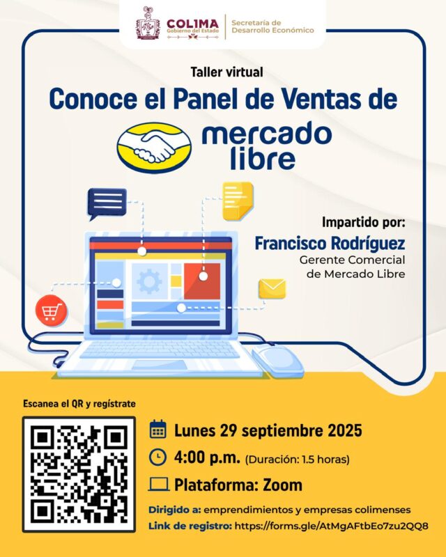 A ravés de un comunicado de prensa, la Secretaría de Desarrollo Económico (Sedeco) del Gobierno del Estado de Colima invita a las y los emprendedores, comerciantes y empresarios de la entidad a participar en el taller virtual gratuito ‘Conoce el Panel de Ventas de Mercado Libre’, el próximo lunes 29 de septiembre a las 4:00 de la tarde a través de la plataforma Zoom, donde podrán aprender a gestionar, optimizar y vender de manera más eficiente en el marketplace número uno de Latinoamérica.