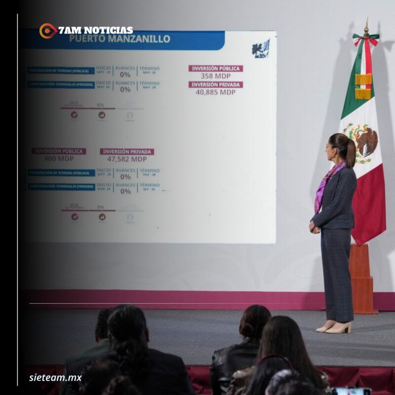 Morales Ángeles explicó que el Nuevo Puerto Manzanillo Cuyutlán contará con cinco terminales portuarias, cada una con un muelle de mil 500 metros y 100 hectáreas de espacio para la operación de carga contenerizada. Este proyecto que contempla una inversión pública mayor a los 18 mil millones de pesos iniciará con una fase de dragado que se prevé completar en julio de 2027.